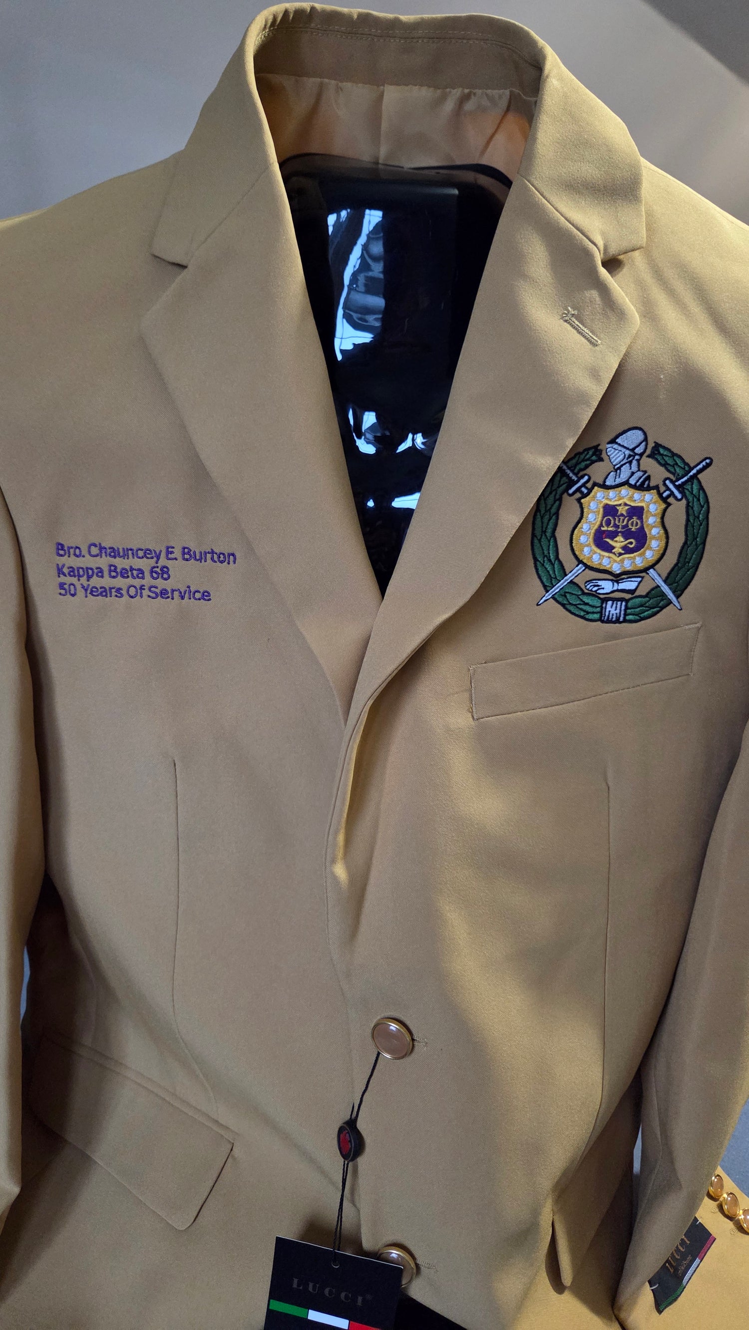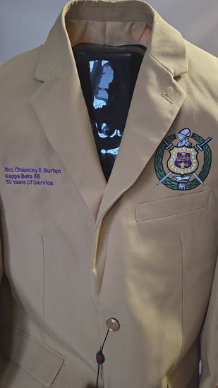 Add Greek embroidered crest to left chest, above pocket and embroidered detailed wording on right chest